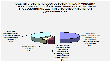 Значимость кадровой проблемы для НКО-сектора подтверждается и анализом ответов на прямой вопрос о соответствии квалификации сотрудников благотворительной организации современным требованиям. Половина участниковопроса считают, что их сотрудникам для работы в благотворительныхорганизациях необходимо приобрести дополнительные профессиональныенавыки. Доля тех, кто достаточно высоко оценивает кадровый потенциал своих организаций, ниже (39%)[14] .