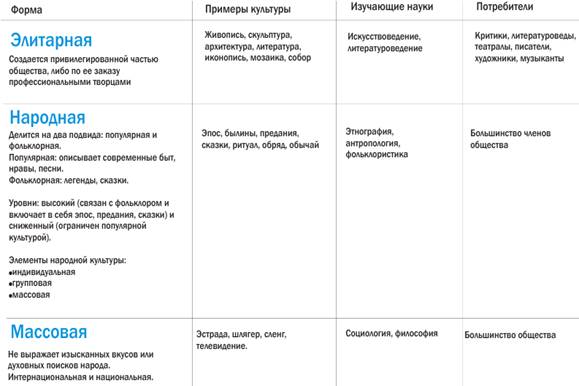 - высокая (элитарная) культура, включавшая изящное искусство, классическую музыку и литературу, создавалась и воспринималась представителями элиты;