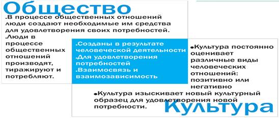Общество и культура активно взаимодействуют друг с другом. Общество предъявляет к культуре определенные требования, культура в свою очередь влияет на жизнь общества и направление его развития.
