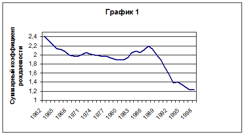 Если рассматривать динамику более точных суммарных коэффициентов (график 1)то видно, что рождаемость начала резко падать в 1987 году. Снижение в период 1962-1972 составило 15,1% а в период 1988-1998 - 41,7%
