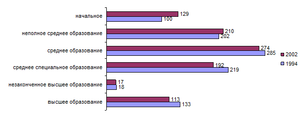 Несмотря на ряд сложностей, связанных с уменьшением объема государственного финансирования образования, перестройки его хозяйственного механизма, количество некоторых образовательных заведений увеличилось (в основном за счет негосударственных). Все это отразилось на положительной динамике таких важных социально-экономических показателей, как уровень образования (рис. 1) и грамотность населения (табл. 2).