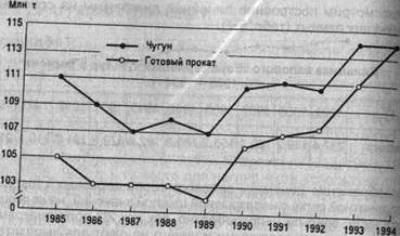 Рис. 5.19. Динамика производства чугуна и готового проката в регионе за 1985-1994 гг.