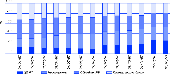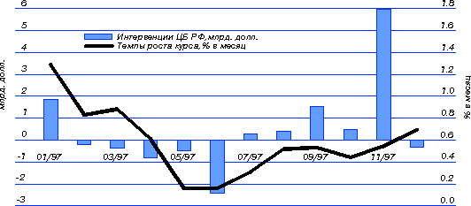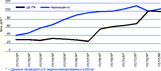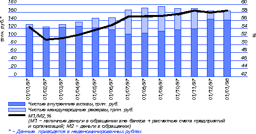 В основе практически всех предварительных расчетов, касавшихся денежного предложения на 1999 г., лежало предположение о сокращении реальной денежной массы (М2). Ожидалось, что, при некотором росте реальных доходов населения сбережения частных лиц не возрастут, а реальные средства предприятий - снизятся. В принципе, данное предположение означало борьбу с инфляцией за счет сокращения совокупного спроса и проведения соответствующей, жесткой, денежной политики, основной составляющей которой должен был стать административный контроль за обменным курсом рубля. Однако подобное намерение входило в противоречие с расчетами, согласно которым рост производства должен был стимулироваться проведением мягкой денежной политики и усилением монетизации экономики.
