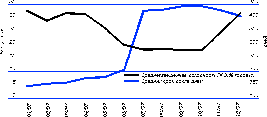 Качественный скачок в развитии рынка государственных ценных бумаг связан с выпуском облигаций федерального займа (ОФЗ). ОФЗ – среднесрочные государственные облигации, которые выпускались в безбумажной форме с изменяемым процентным купоном, выплачиваемым поквартально. Срок их обращения – более 1 года. Их доля в суммарном обороте государственных краткосрочных облигаций и облигаций федерального займа к середине февраля 1996 года составила 17,8 %. В марте 1998 года официальная доходность по ГКО и ОФЗ в среднем составила 30% годовых.