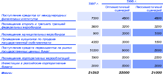 Таким образом, в 1994 г. совпали во времени два качественных сдвига: во-первых, резко увеличилось предложение ценных бумаг вследствие интенсификации эмиссионной деятельности (эмиссия акций приватизированных предприятий, государственных ценных бумаг, а также активизация компаний, аккумулирующих средства населения), и, во-вторых, резко увеличился спрос на инвестиционные ценности (за счет иностранных инвесторов; формирования устойчивого слоя населения, обладающего сбережениями долгосрочного характера, которые могут быть инвестированы, в том числе в ценные бумаги; а также притока на рынок ценных бумаг средств банков и других финансовых структур в результате снижения прибыльности операций на валютном и кредитном рынках).