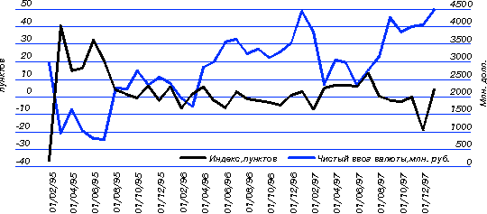 В качестве основных каналов денежного предложения должны были выступить централизованные кредиты Министерству финансов РФ и покупка Центральным банком РФ иностранной валюты на открытом рынке. Важнейшими же сценарными параметрами были приняты объем кредитов, предоставляемых России международными финансовыми организациями (вернее, их недостаток), и размер платежей, связанных с обслуживанием внешнего долга. По итогам года практически весь прирост денежной базы (узкой) был обеспечен за счет покупки Центральным банком иностранной валюты на рынке; нетто-покупка ЦБР иностранной валюты выразилась значением 3.8 млрд. долл., или около 102 млрд. руб. При этом рост денежной базы в 1999 г. составил около 114 млрд. руб.