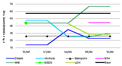 П ервые прогнозные оценки основных экономических и финансовых показателей на 1999 г., рассчитанные во второй половине предшествовавшего года, характеризовались достаточно существенным разбросом оценок и, как показало время, были крайне далеки от действительности. Это вполне естественно, поскольку проведение сценарного анализа было затруднено неопределенностью политических решений в отношении ситуации экономического кризиса, не говоря уже о конкретных мерах, предпринимаемых в рамках общих политических установок.