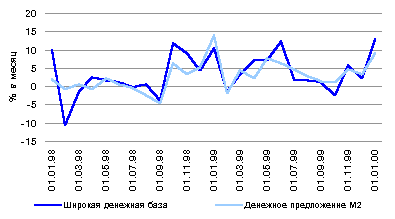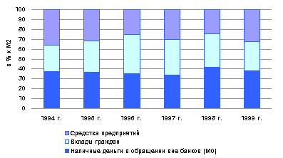 П о итогам 1999 г. денежное предложение (агрегат М2) возросло на 57.2%, в том числе наличные деньги в обращении вне банковской системы (М0) - на 42.0%, объем безналичных денег - на 68.2%. Таким образом, возросло и совокупное денежное предложение в реальном исчислении (скорректированное на индекс потребительских цен).