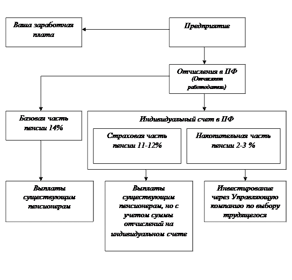 Новые законы предполагают следующую схему распределения платежей в пенсионную систему: 14% от заработной платы поступает на выплату базовых пенсий, 8% зачисляется на индивидуальный лицевой счет в Пенсионном фонде, на основании которого будет рассчитываться пенсионный капитал, а 6% идут на специальный счет для дальнейшего инвестирования[1] . Представляется, что было бы логичней обязать работников самим уплачивать отчисления в накопительную систему, что в большей степени отвечало бы идеологии рыночных реформ и повышало ответственность работников за свое будущее.