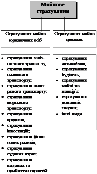 Майнове страхування об'єднує найрізноманітніші види страхування, які поділяються на дві підгалузі: страхування майна громадян і страхування майна юридичних осіб. Виокремлення цих двох підгалузей пов'язане з істотними розбіжностями у практиці проведення страхування майна юридичних і фізичних осіб.