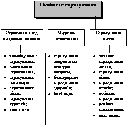 Особисте страхування включає три підгалузі. Їх існування пов'язане з різною тривалістю договорів страхування і різними обсягами страхової відповідальності (переліком подій, на випадок яких проводиться страхування). Підгалузями особистого страхування є страхування від нещасних випадків, медичне страхування, страхування життя. У рамках цих підгалузей виокремлюються види страхування.