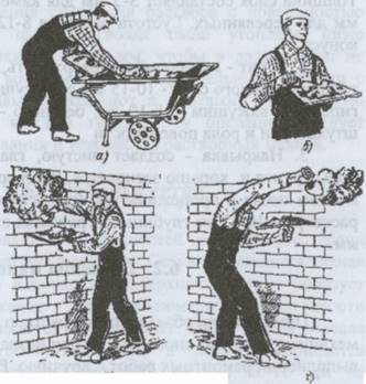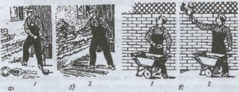 а ) хватка ковша; б ) набрасывание раствора на стены; в ) на потолок;
