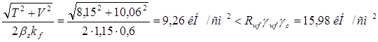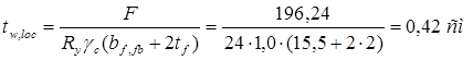 Поскольку условия Rw , f / Rwz = 200 / 166,5 = 1,2 > 1,1 и Rw , f = 200 МПа < Rwz βz / βf = 166,5*1,0/0,7 = 237,85 МПа выполняются, достаточно расчета по металлу шва.