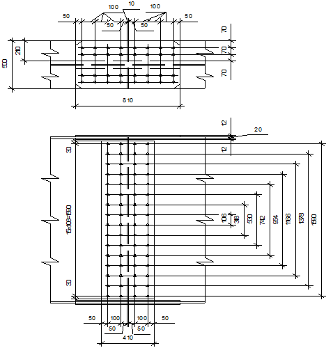 Стык листов стенки разной толщины выполняем на 100 мм ниже горизонтального ребра оголовка.