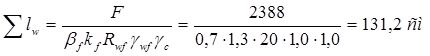 При максимальной высоте шва kf , max = 1,2 tmin (tmin = tw = 14 мм), то есть kf , max = 16,8 мм, принимаем kf = 13 мм. Длина швов равна