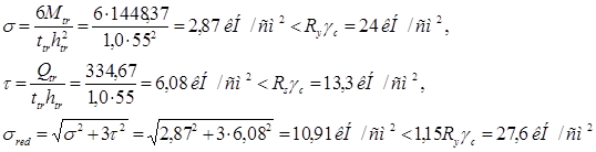 Требуемая высота траверсы htr , r = lw , r + 1,0 = 53,39 см. Принимаем высоту траверсы htr = 550 мм и толщину ttr = 10 мм.