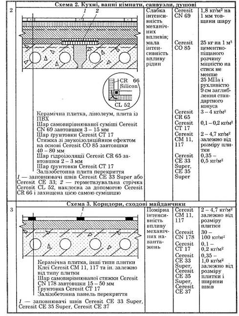 Для захисту нижче розміщених приміщень від впливу води та інших нейтральних рідин по твердих основах рекомендується застосовувати полімерцементні суміші - Ceresit СR 65, 66, СL 50, 51; по основах, що зазнають незначних деформацій від температурних впливів та інших навантажень, - бітумно-полімерні мастикові чи плівкові - Ceresit СR52, 41, 42, 43, 44, 46, ВТ 21, 26, 41.