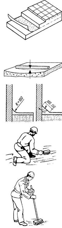 3. Місця примикання підлог до стіп округляють під кутом 45° шаром цементного розчину, який складається з цементу і піску в масових частинах 1: 3.