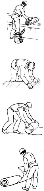 6. Руберойд, склоруберойд та інші матеріали з мінеральною насипкою розгортають і протирають ганчіркою, змоченою в соляровому мастилі. При цьому знімають зайву мінеральну насипку, рулонні матеріали внаслідок цього набувають еластичності, що зміцнює зчеплення з основою при наклеюванні.