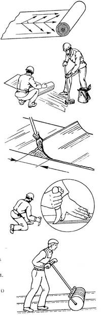14. Полотнище накочують до основи зг г допомогою ручного катка. Виявлені пухирі розрізають хрестоподібно ноже\ Підрізані краї відтинають, промазують мастикою і знову приклеюють, ретельн розгладжуючи їх шпателем.