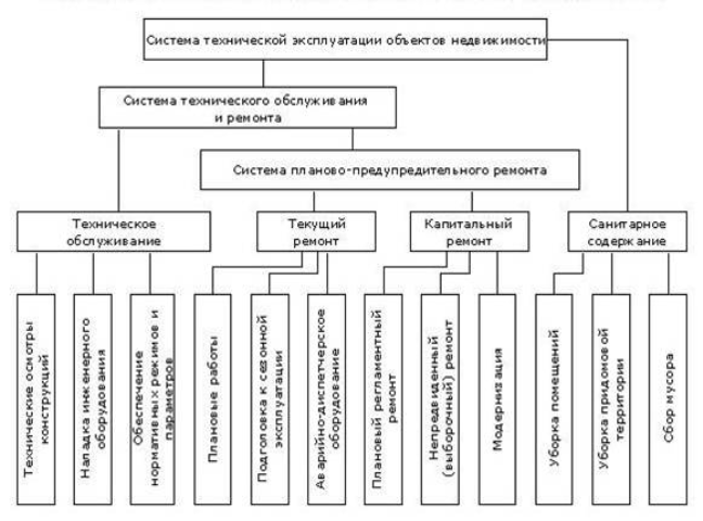 цессом, который требует правильной организации и своевременного планирования. Система технической эксплуатации – это совокупность трудовых, материальных и финансовых ресурсов, предназначенных для выполнения задач эксплуатации. Наличие документации, устанавливающей правила их взаимодействия, координирует деятельность исполнителей. Техническая эксплуатация недвижимости формируется из следующих составных видов деятельности.