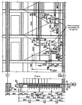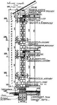 На зображено вертикальну порядівку - розріз по вікнах зовнішньої стіни двоповерхового будинку, стіни якого складені з легкобетонних семищілинних каменів двох типів розміром: 390x190x188 мм і поздовжніх половинок розміром 390x190x188 мм. Шви завтовшки 10 мм.