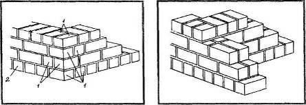 При кладці простінків (4, б) на одному з них підсобник розкладає цеглину і розстилає розчин, а на іншому простінку провідний муляр веде кладку. Потім вони міняються місцями і продовжують роботу.