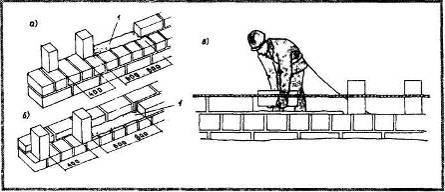 а - кладка зовнішньої ложкової версти; б - кладка внутрішньої версти і забутки; в - кладка зовнішньої тичкової версти; 1 - муляр 3-го розряду; 2 - муляр 4 - 5-го розрядів; 3 - муляр 2-го розряду