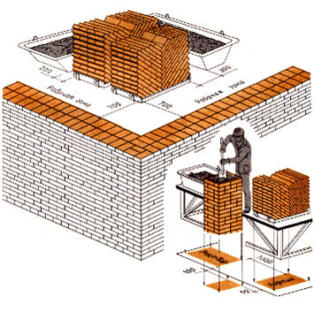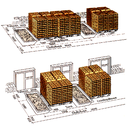 Щоб муляри виконували менше рухів, піддони з цеглиною ставлять напроти простінків. Ящики з розчином встановлюють напроти отворів, довгою стороною перпендикулярно стіні, що зводиться.