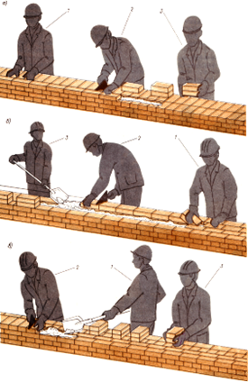 Провідний муляр викладає верстові ряди і контролює правильність кладки. Він рухається за підсобником, що розкладає цеглину і розстилаючим розчин. В цей час інший підсобник укладає забутку.