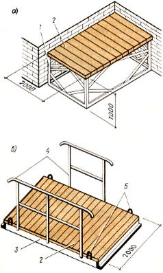 а - для кладки стін лоджій, перегородок; би - длякладки стін сходових кліток; 1 - сталева опора-тумба; 2 - дощатий настил; 3 -сталева рама; 4 - огорожа;5 - петливши для строповки