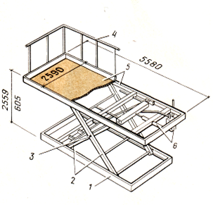 1 - опорна рама; 2 - рухомі важелі; 3 - шарнір; 4 - знімна огорожа; 5 - платформа з рабочим настилом; 6 -гидросистема