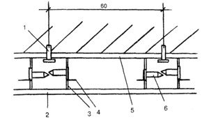 2 — прямой подвес; 3 — гипсокартонная панель; 4 — герметик;