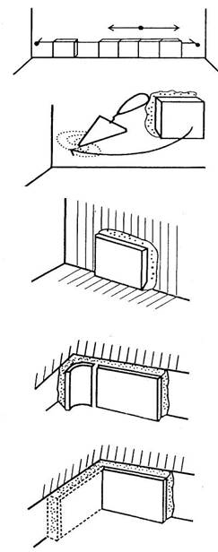 14.Якщо кути приміщення облицьовуватимуться фасонними кутовими плитками, то при кладці ряду плиток вони не повинні доходити до кута на відстань, що дорівнює ширині сторони кутової плитки, яка заходить на стіну.