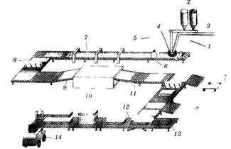 1 — рулонний картон для лицьової поверхні плит; 2 — посудина для гіпсу; 3 — подача води; 4 — змішувач (гіпсозмішувач); 5 — рулонний картон для нижньої (тильної) поверхні плит; 6 — формувальний вузол; 7 — вузол різання плит; 8 — вузол кантування плит; 9 — завантажувальний міст; 10 — сушильна камера; 11,12 — розвантажувальний міст; 13 — вузол пакетування; 14 — штабелеукладач