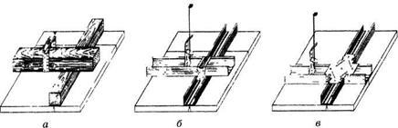 а — із двох рядів дерев'яних брусків; б — із двох рядів металевих профілів; в — рамна конструкція каркаса з металевих профілів