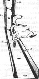 а) для шпаклювання з армувальною стрічкою (шпаклівкою "Фугенфюллер") рубанком кромочним зняти фаску під кутом 45° на 1/3 товщини ГКП і видалити картон уздовж кромки в місцях укладання стрічки (рис. 3.11.);