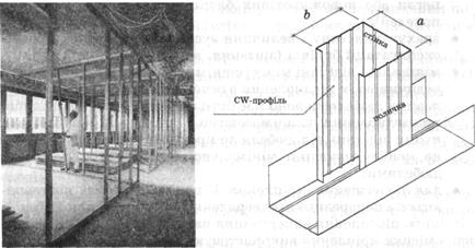 Металевий каркас збирають зі стельового профілю CD 60x27х0,6 і напрямних стельових профілів UD 28x27x0,6, напрямних профілів (UW) і стоякових профілів (CW). Напрямні профілі каркаса прикріплюють дюбелями до підлоги і стелі з кроком не більше за 1 м. Через кожні 60 см в напрямні профілі точно за виском встановлюють стояки з CW-профілів, які скріплюють з ними просікачем. Через кожні 1,5 м стояки кріплять до стінки за допомогою кронштейнів. Кронштейнами можуть слугувати прямі стельові підвіси. Між кронштейнами і стінкою розміщені електрична проводка, сантехнічні трубопроводи, а також тепло-і звукоізоляційний матеріал.