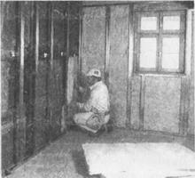 Якщо виникає необхідність улаштування звукоізоляційного шару при сухому оштукатурюванні стін, то спочатку до стіни приклеюються ізоляційні плити з мінеральних волокон, а потім до них приклеюють ГКП будівельним клеєм "Перлфікс" (рис. 7.1). З цією метою використовують плити з позначенням WV. Висота багатошарової обшивки з використанням ГКП (сухої штукатурки), зазвичай, не перевищує 3 м. Звукоізоляційні плити монтують горизонтально з перев'язкою швів. Будівельний клей, котрим звукоізоляційні плити приклеюють до поверхні стіни, не повинен витікати зі швів, оскільки в іншому разі слід очікувати погіршення тепло- і звукоізоляції стінових огороджень.