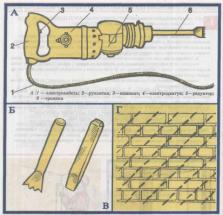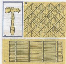 Відстань між окремими драницями повинна бути такою: для горизонтальних поверхонь - не більше 45 мм, для вертикальних - не більше 55 мм. Прибивають дранку штукатурними цвяхами завдовжки 30-40 мм. Цвяхи забивають штукатурним молотком (А) через одне-два перехрещення драниць. Між поверхнею і дранкою утворюється простір, в який запливає розчин і міцно зчіплюється з ними.