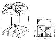 На рис. 1.1 показано образование крестового свода, также на этом рисунке показано два полуцилиндра I и II равных диаметров, которые имеют общую точку, касательную прямую и пересекаются по двум плоским кривым полуэллипсам. В крестовом своде вертикальная нагрузка передается на четыре опоры, а распор отсутствует. Если линия пересечения представляет собой кривую четвертого порядка, то это говорит о том, что диаметр одного из полуцилиндров меньше другого.