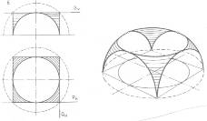 На рис.4 показан парусный свод. Если от полусферического сегмента помимо четырех боковых частей отсечь горизонтальной плоскостью Sверхнюю часть, то получится парусный свод. В результате этого сечения получается горизонтальная окружность, которая опирается на четыре арки. Основой парусного свода является переходная форма от его нижнего квадратного основания к его верхнему цилиндрическому объему.