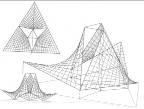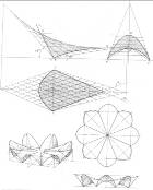 На рис.12 дана схема покрытия, представляющая собой минимальную поверхность с контуром, состоящим из четырёх дуг окружностей. Поверхности этого вида имеют наименьшую площадь при заданном контуре и одинаковую напряжённость в любой точке. Форма поверхности зависит только от формы кривой контура, отдельные её участки имеют положительную и отрицательную переменную кривизну.