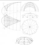 На рис.9 приведено покрытие, которое образовано восемью отсеками эллипсоида – нелинейчатые поверхности переменной положительной кривизны. В целом это перекрытие имеет вид выпуклой, а не вогнутой формы. Отсек этой поверхности образован в результате сечения эллипсоида вращения двумя вертикальными плоскостями и фронтально-проецирующей плоскостью. Линии пересечения отсеков друг с другом – плоские – эллипсы. Примером этого служит аналогичное покрытие, осуществленное при сооружении рыночного павильона в Руайане (Франция), состоящая из тринадцати отсеков.