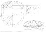 На рис. 10.1 приведены проекции сложной поверхности вращения с образующей переменного вида. Она пересекает ось вращения в точке А и направляющую линию в точке В. Оомы.существленное при сооружении рыночного павильона в Руайане (Франция)и и фронтально-проецирующбразующая совершает двойное движение : равномерное движение вокруг оси и колебательное движение конца В образующей в вертикальной плоскости на величину m – амплитуды перемещения. В результате двойного движения образуется волнообразная поверхность, сочетающая в себе положительную двоякую и отрицательную кривизну и обладающая, как и складчатые покрытия, большой пространственной жёсткостью. Граничный контур представляет собой синусоидальную пространственную кривую, лежащую на сферической поверхности. На чертежах её условная развёртка на плоскости. Период колебательного движения n, когда точка В вернётся в исходное положение, может быть различным, в приведённом примере угловая его величина равна: