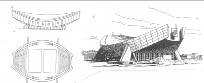 На рис. 14 показан фасад, план и общий вид спортивного зала в Кагаве (Япония), напоминающего корпус корабля. Вантовое покрытие зала представляет собой отсек поверхности, близкой к гиперболическому параболоиду, заданному двумя семействами кривых. Боковые участки – линейчатая поверхность цилиндроида являются пространственные кривые борта и днище корпуса корабля, имеющие различную кривизну, а образующая – прямая, параллельная направляющей плоскости. Сооружение стоит на четырёх опорных пилонах.