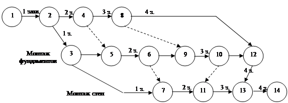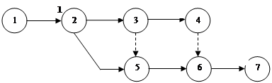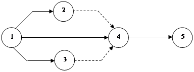 2.1.4 При выполнении параллельных работ, т.е. если одно событие служит началом двух работ или более, заканчивающееся другим событием, вводятся зависимость и дополнительное событие, иначе одинаковые события будут иметь одинаковый ход