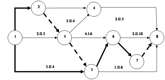 | Линейная диаграмма | Шифры работ | 1-2 1-2 1-5 2-3 2-4 3-4 3-5 3-6 4-8 5-6 5-8 6-7 6-8 7-8 |