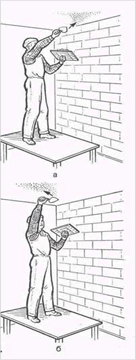 С сокола раствор набирают концом или правым ребром кельмы от себя. Набрасывание раствора на стену производится резким движением кисти руки (см. рисунок).