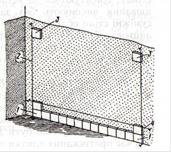 Вместо драни можно использовать плетеную или тканую металлическую сетку с ячейками не более 50X50 мм. Плетеную сетку туго натягивают на поверхность и закрепляют гвоздями длиной 50...70 мм на расстоянии 100...120 мм друг от друга. Гвозди следует забивать не до конца, а оставлять 10...1 5 мм для загибов, закрепляющих сетку. Тканую сетку лучше закреплять к предварительно набитым рейкам толщиной 3...6 мм. Чтобы избежать коррозии, сетки и гвозди следует окрасить масляной краской, покрыть лаком или цементным молоком. К деревянным потолкам сетки закрепляют тем же способом, что и к стенам.